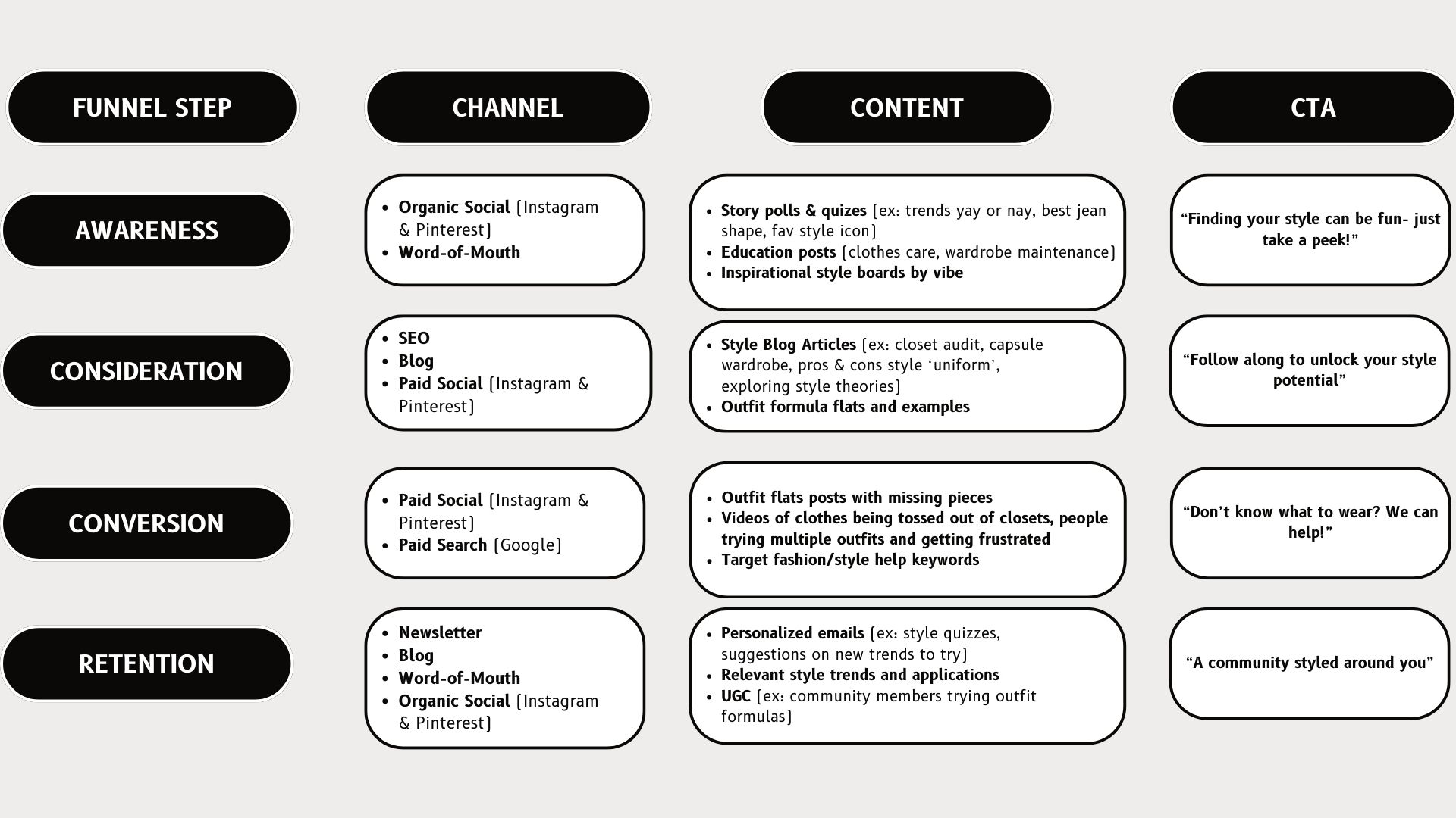 - Draw conclusions to outline a full funnel, multi-channel marketing strategry for the brand