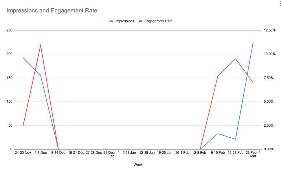 - Impressions sharply increased in first week of March, but engagement rate declined