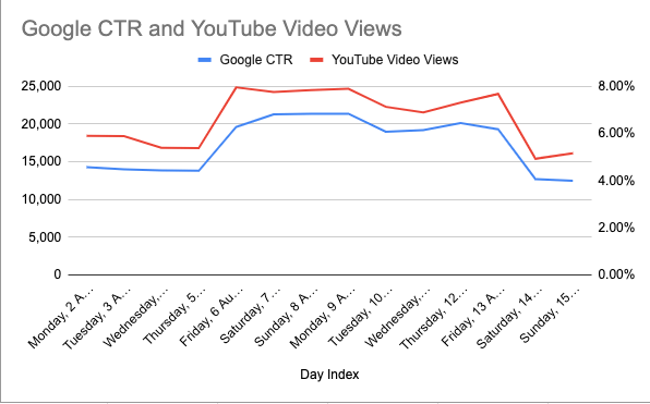 - YouTube views and Google CTR follow same pattern: as video increase on YouTube, click-through rates increase on Google