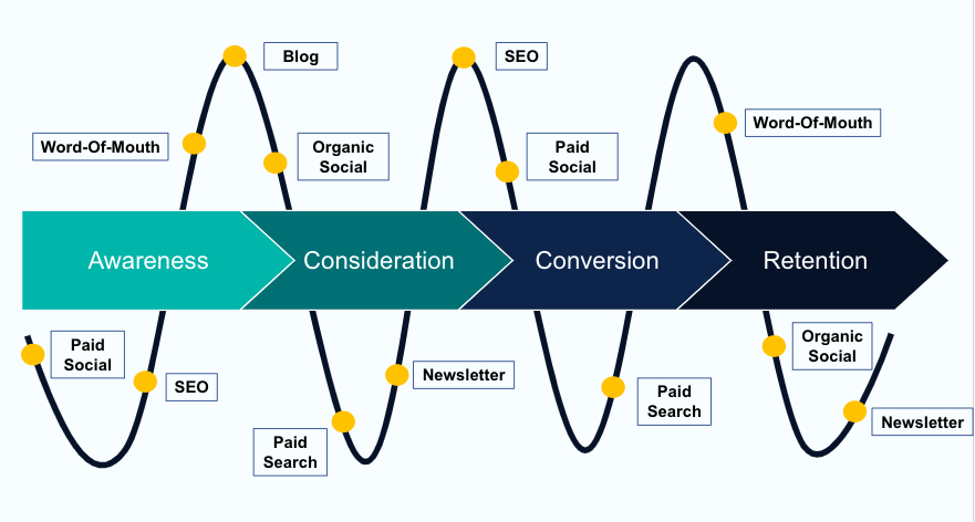 - Utilize each channels’ strengths to target specific moments in the funnel in order to best capture potential clients and guide to the next stage